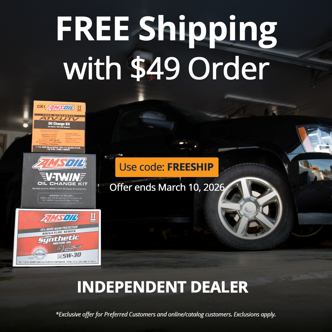 You get FREE SHIPPING with a Purchase of $49 in Amsoil Products. Just Enter the Code FREESHIP at Checkout. This offer ends March 10.. Both Online and Preferred Customers are Eligible.