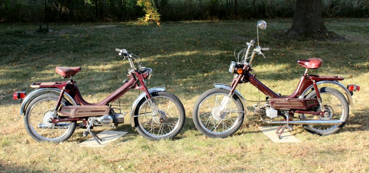 Twin Columbia Commuter mopeds. These both run good. They are mostly original. I have been riding the one regularly. One of them has new brake shoes in the front and rear.