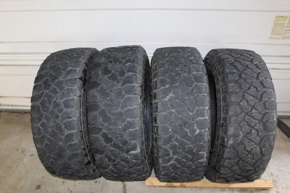 Kenda Klever R/T 275/70R18. These tires have a triple threat sidewall and are 10 ply. Two of the tires are in decent shape with 8/32 tread. One has some cupping and 8/32 tread. One has cupping and uneven wear. These tires cost $275 a piece new. That is $1100 for 4 tires.